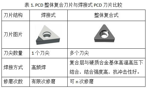 相比焊接式PCD刀片,PCD整體復(fù)合刀片有以下優(yōu)點: